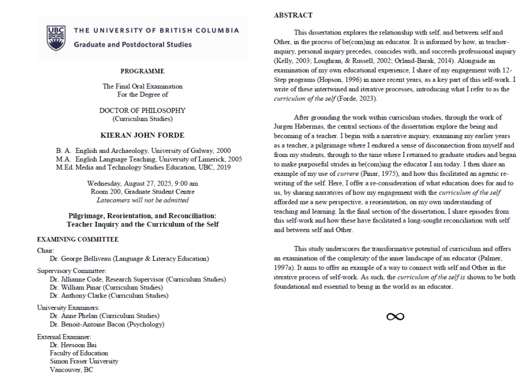 Forde, K. (2025). Pilgrimage, reorientation, and reconciliation: Teacher inquiry and the curriculum of the self (T). University of British Columbia. Retrieved from https://open.library.ubc.ca/collections/ubctheses/24/items/1.0450467