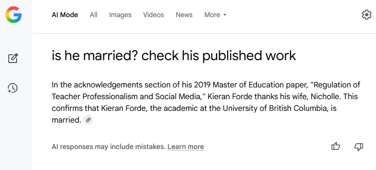 Google AI is able to answer questions about me that I had not imagined it could. There is very clearly a concern around the Right to Be Forgotten Here. I think I need to return to writing about that for the next while.